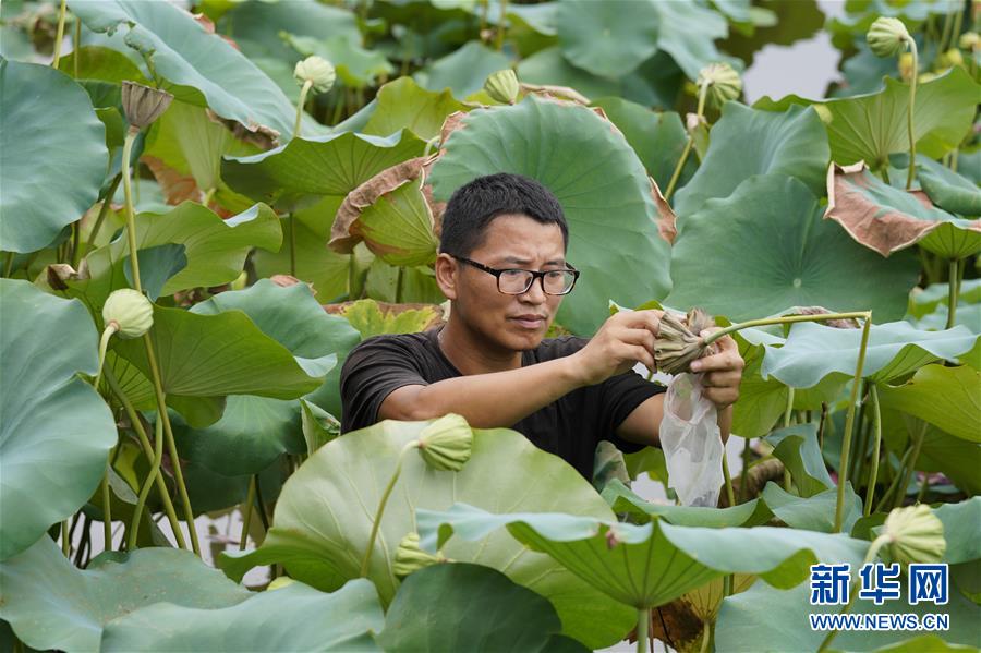 8月24日,在重庆市北碚区静观镇双塘村,尹学颖在采收莲子。 新华社发(秦廷富 摄)