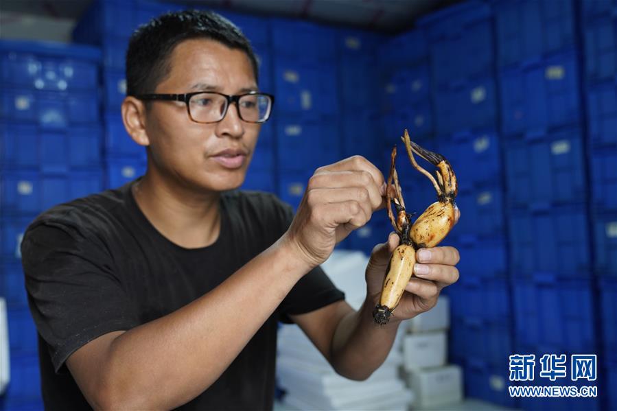 8月24日,在重庆市北碚区静观镇双塘村,尹学颖在冷库查看种藕保鲜效果。 新华社发(秦廷富 摄)