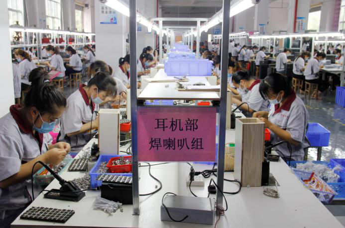 工人们正在忙碌地加工制作耳机。朱晓玲摄