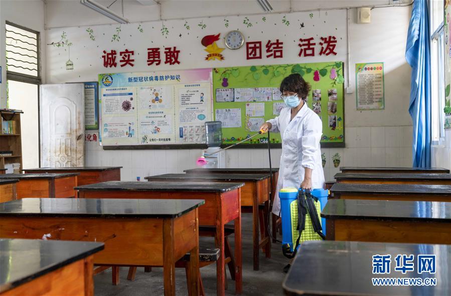 8月27日,勐卯小学工作人员对教室进行消杀。 开学在即,位于云南省边境地区的德宏傣族景颇族自治州瑞丽市勐卯小学提前开展校园清洁防疫、储备物资检查、教学器材维护等工作,做好秋季学期开学和疫情防控准备,为即将返校的学生营造舒适安全的学习环境。 新华社发(陈欣波 摄)