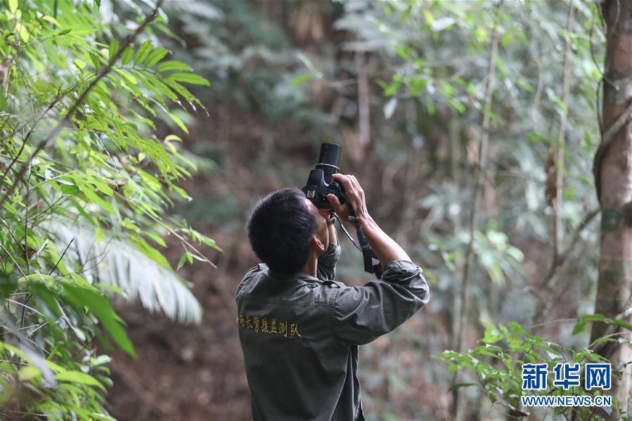 海南长臂猿监测队员李文永在位于海南白沙黎族自治县的热带雨林中拍摄海南长臂猿(2019年10月25日摄)。新华社记者 蒲晓旭 摄