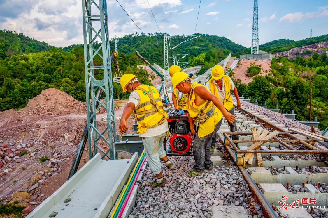2020年9月1日,在金台铁路浙江省台州市仙居县永安溪特大桥施工现场,铁路建设者正在紧张地施工。金台铁路是浙江省第一条自主建设的电气化铁路,连接着金华、丽水、台州,全长226.12公里,设计时速160公里,计划2020年建成。(陈月明摄/光明图片)