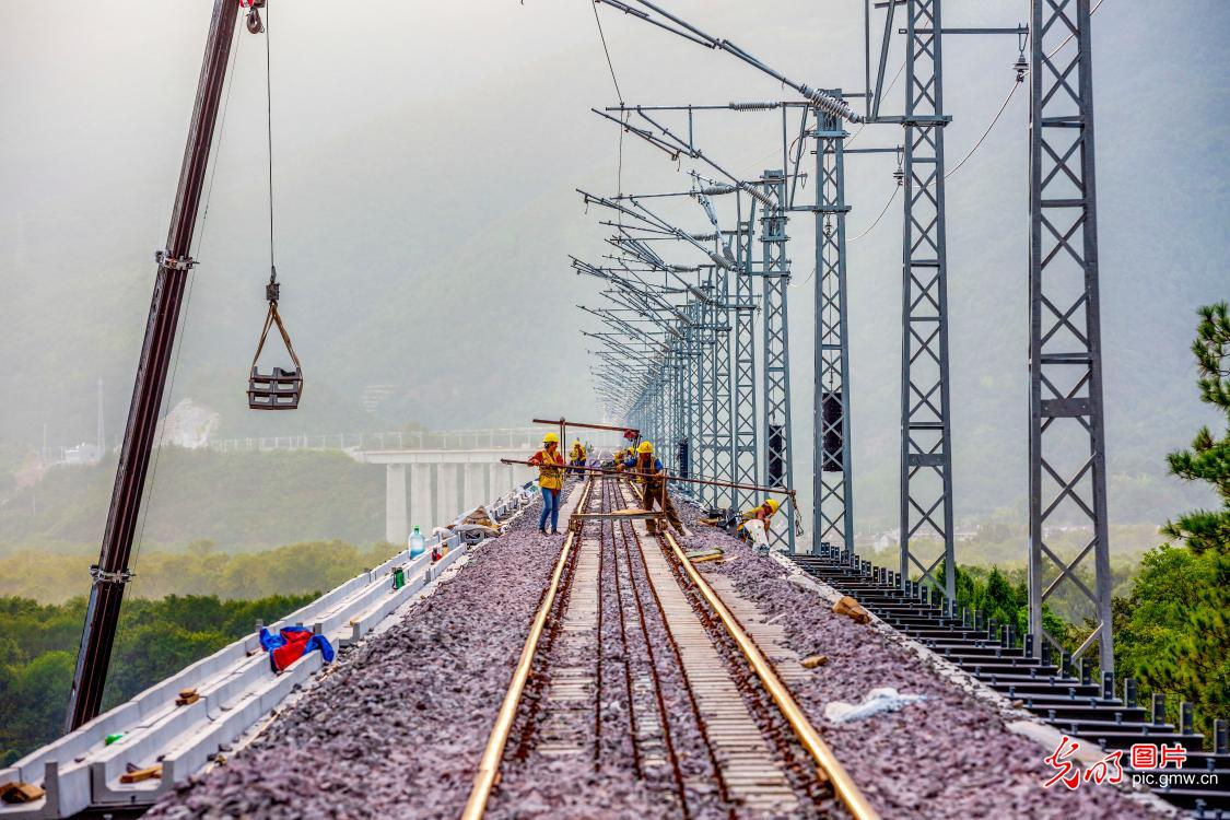 2020年9月1日,在金台铁路浙江省台州市仙居县永安溪特大桥施工现场,铁路建设者正在紧张地施工。金台铁路是浙江省第一条自主建设的电气化铁路,连接着金华、丽水、台州,全长226.12公里,设计时速160公里,计划2020年建成。(陈月明摄/光明图片)