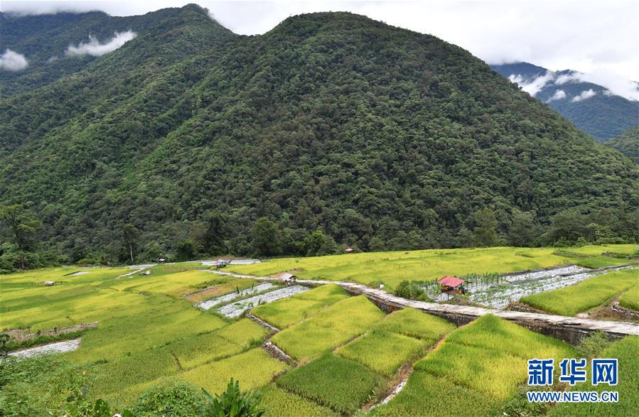这是8月29日拍摄的墨脱稻田。 西藏林芝市墨脱县位于西藏东南部,平均海拔1200米。因地处雅鲁藏布江下游、喜马拉雅山脉东端南麓,这里湿润多雨,风景秀丽,气候宜人。 新华社记者 觉果 摄