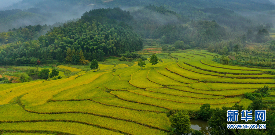 9月3日,金秋时节,安徽省旌德县兴隆镇万亩梯田层层叠叠如链似带,犹如巨幅五线谱奏响在山间田野。