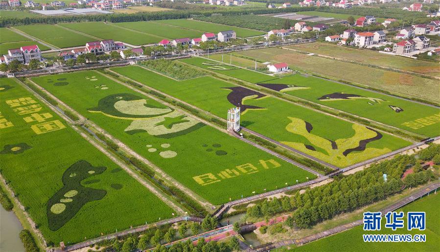 这是上海崇明区横沙乡丰乐村的稻田画(9月8日摄,无人机照片)。 在上海崇明区横沙乡丰乐村,一片稻田画成为当地一道靓丽的风景。稻田中呈现出江豚和将于2021年在崇明举办的花博会主题元素图案,引人注目。 新华社记者 方喆 摄