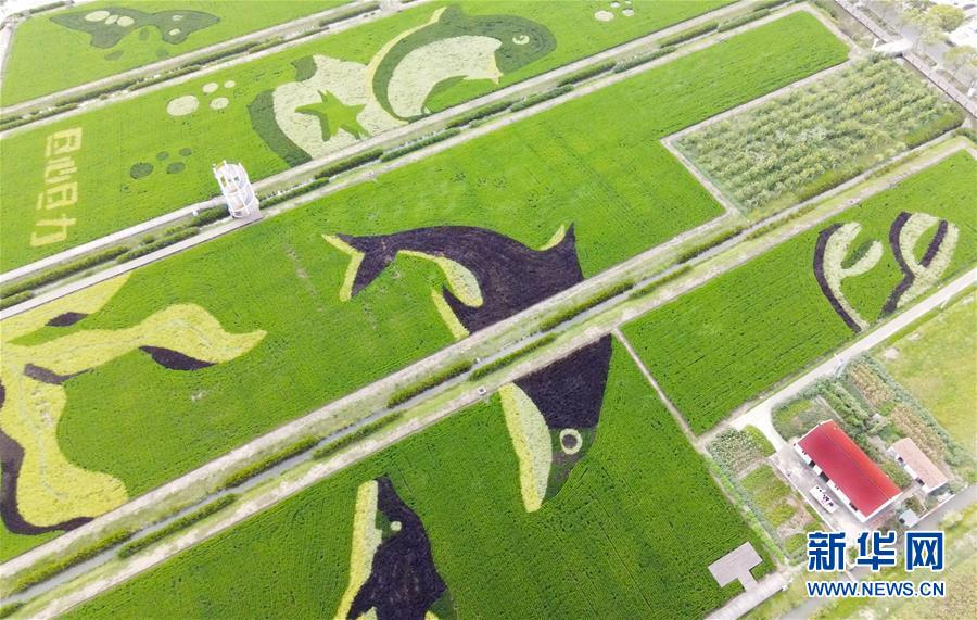 这是上海崇明区横沙乡丰乐村的稻田画(9月8日摄,无人机照片)。 在上海崇明区横沙乡丰乐村,一片稻田画成为当地一道靓丽的风景。稻田中呈现出江豚和将于2021年在崇明举办的花博会主题元素图案,引人注目。 新华社记者 方喆 摄