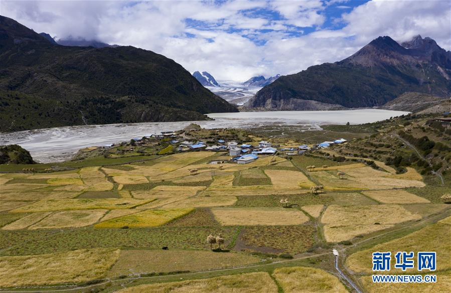 这是9月10日在西藏昌都市八宿县然乌镇来古村拍摄的青稞田(无人机照片)。 9月,生活在来古冰川脚下的西藏昌都市八宿县然乌镇的村民开始秋收,金色的农田里,手扶拖拉机的马达声和村民的吆喝声交织成一段优美的劳动之歌。 新华社记者 普布扎西 摄