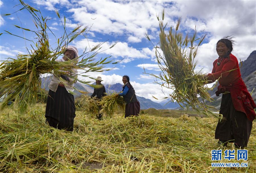 9月10日,西藏昌都市八宿县然乌镇康沙村的村民在收青稞。 9月,生活在来古冰川脚下的西藏昌都市八宿县然乌镇的村民开始秋收,金色的农田里,手扶拖拉机的马达声和村民的吆喝声交织成一段优美的劳动之歌。 新华社记者 普布扎西 摄