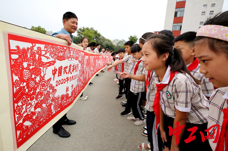9月21日,山东省枣庄市建设路小学的学生在观看民间艺人李化义(左一)创作以中国农民丰收节为主题的剪纸作品。该作品长15米,内容以二十四节气物候特征为主线,农耕文化、民间风俗等贯穿其中,寓意农民幸福安康,共庆丰收。