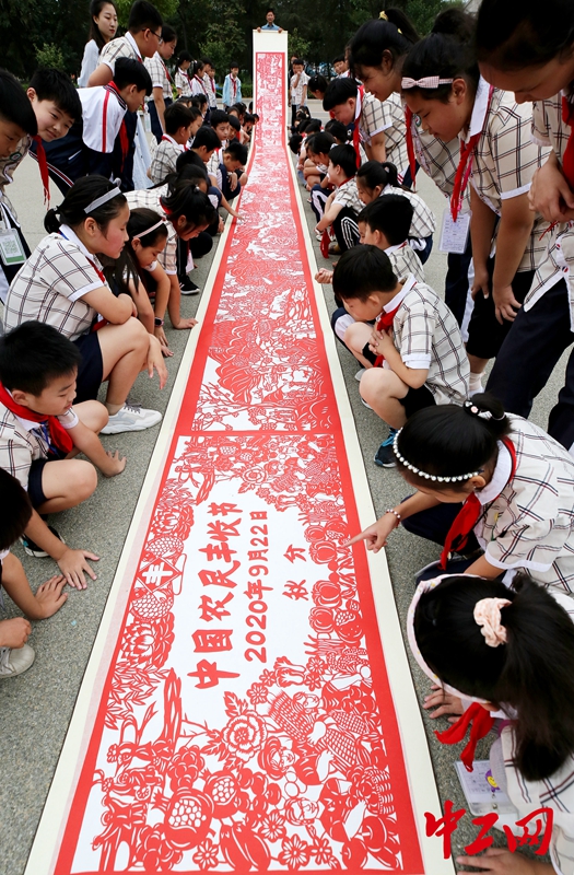 9月21日,山东省枣庄市建设路小学的学生在观看民间艺人李化义(中)创作以中国农民丰收节为主题的剪纸作品。该作品长15米,内容以二十四节气物候特征为主线,农耕文化、民间风俗等贯穿其中,寓意农民幸福安康,共庆丰收。