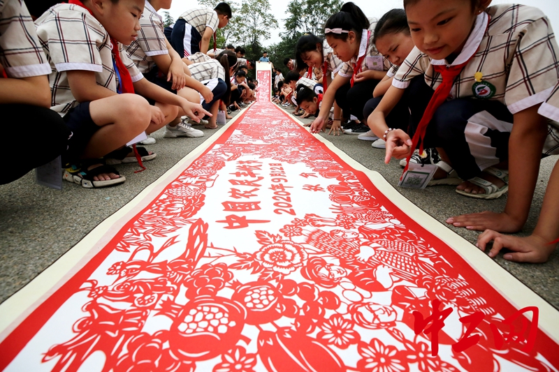 9月21日,山东省枣庄市建设路小学的学生在观看民间艺人李化义(中)创作以中国农民丰收节为主题的剪纸作品。该作品长15米,内容以二十四节气物候特征为主线,农耕文化、民间风俗等贯穿其中,寓意农民幸福安康,共庆丰收。