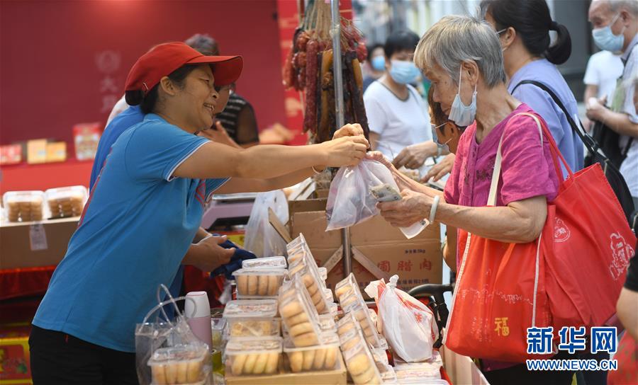 9月23日,市民在北京路购买广式糕点。 当日,广州市北京路步行街完成改造提升,新装亮相。北京路是广州建城两千多年来,从未偏移、断代的城市中轴线,是商务部批准的首批11条改造提升试点步行街之一。此次改造提升致力突出岭南特色,打造集商业购物、文化体验、旅游休闲等功能于一体,传统与现代交融,国潮品牌与国际时尚交相辉映的高品质全国示范步行街。 新华社记者 卢汉欣 摄