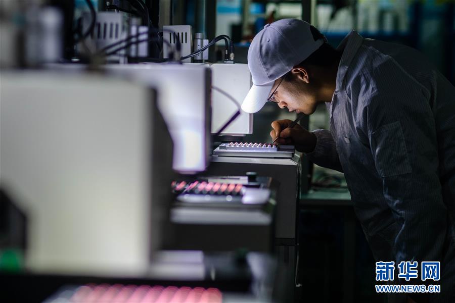 9月29日,搬迁户在会泽县钟屏街道奋精电子扶贫工厂进行电焊作业。新华社记者 胡超 摄