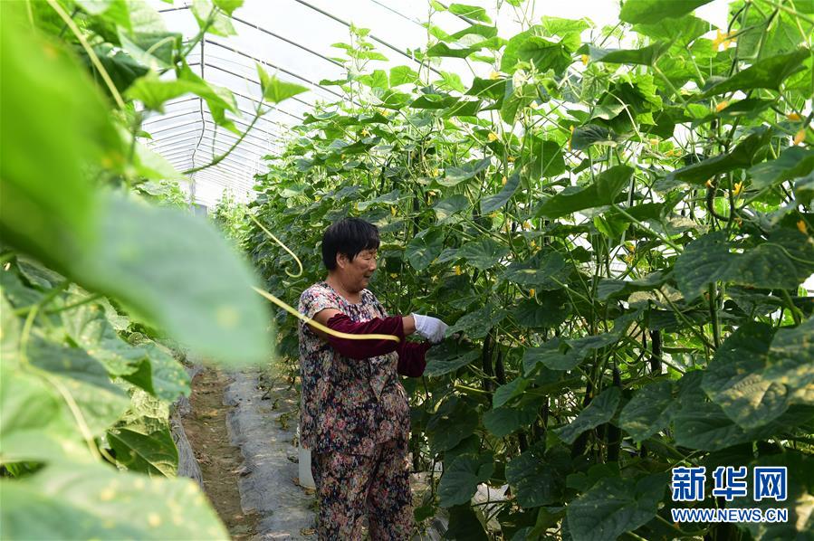 9月30日,在肥东县牌坊回族满族乡许井社区蔬菜扶贫产业园,农民在大棚内采摘黄瓜。新华社记者 黄博涵 摄