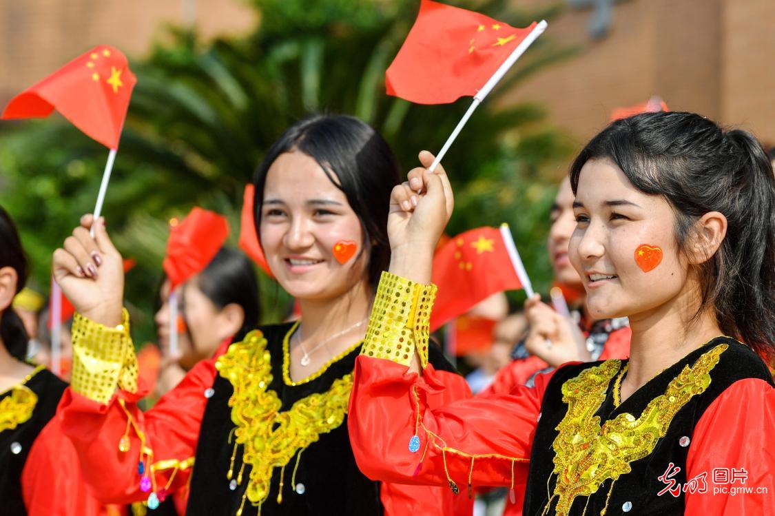 2020年10月1日,浙江省湖州市长兴职教中心,新疆班、云贵班学生们欢唱《歌唱祖国》。当日,长兴县职业技术教育中心学校举行"民族团结一家亲国庆中秋大联欢"主题活动,内地新疆中职班、长兴—云贵协作扶贫定向就业班的师生们欢聚一堂,欢度国庆节和中秋佳节。(谭云俸摄/光明图片)