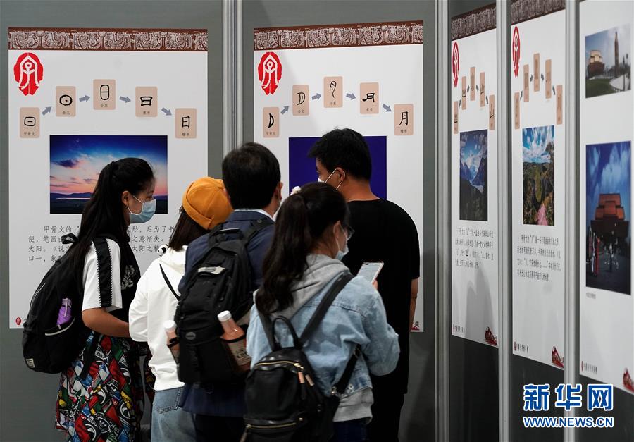 10月1日,旅客在安阳东站候车厅观看展示文字演变过程的展板。 当日,铁路部门联合中国文字博物馆在河南安阳东站候车厅举行庆祝活动,通过现场讲解甲骨文、拓印及“我和我的祖国”快闪等互动体验活动,营造喜悦的节日氛围。 新华社记者 李安 摄