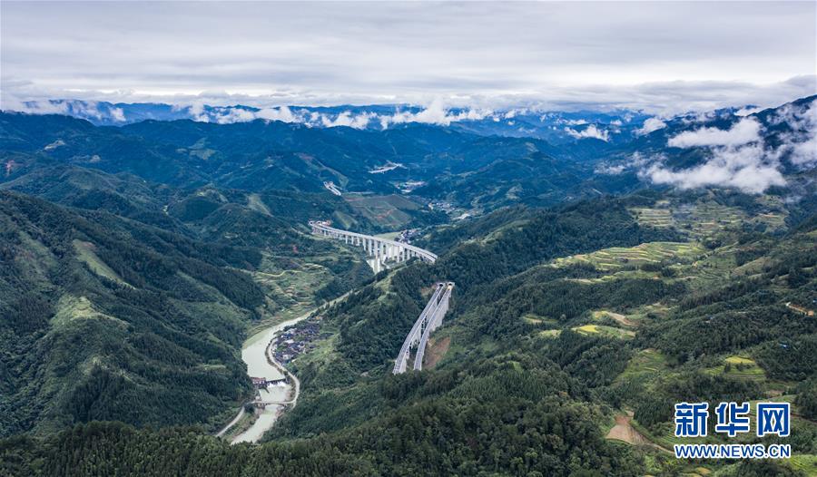 这是剑榕高速榕江北至寨蒿路段(9月29日摄,无人机照片)。 10月1日,由中交一公局集团有限公司承建的贵州剑(河)榕(江)高速公路开通试运营,实现全线通车。剑榕高速公路跨越三穗、剑河、榕江三个县,全长约118公里。 新华社记者 陶亮 摄