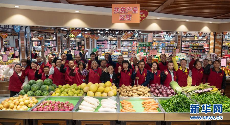 10月14日,在湖南省邵阳市隆回县都来连锁超市,残疾人罗龙桂(前排中)与残疾员工们合影。罗龙桂修过多年钟表电器,后来开办连锁超市,成为一名企业家,他的企业先后帮助200余名残疾人和120余户贫困家庭脱贫。 10月14日,中国残联和国务院扶贫办在京联合举办的“2020年全国扶贫日系列论坛——残疾人脱贫攻坚论坛”公布,脱贫攻坚以来,我国累计有近700万贫困残疾人实现脱贫。在脱贫攻坚路上,更多的残疾人身处逆境却自强不息,以坚毅乐观的态度克服自身缺陷,战胜贫困。 新华社记者 才扬 摄