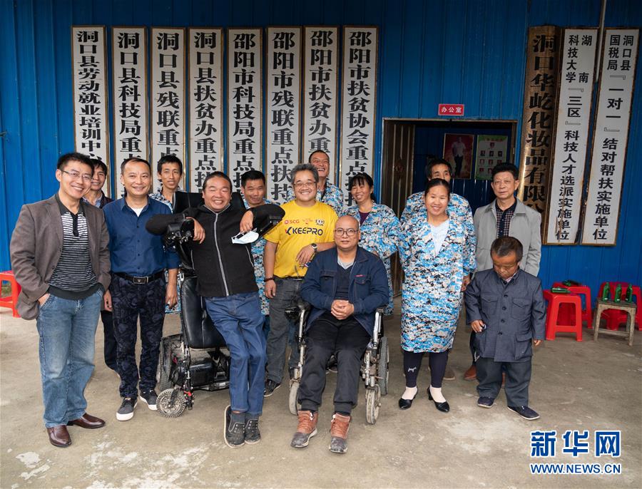 10月13日,在湖南省邵阳市洞口县华屹化妆品有限公司,残疾人张赫伦(左五)与他的伙伴们合影留念。42岁的张赫伦在1998年因强直性脊柱炎致一级残疾,失去生活自理能力。他通过生产洗发水致富,主动吸纳18名残疾人就业,还以“基地+农户”模式带动50多户贫困户脱贫致富。 10月14日,中国残联和国务院扶贫办在京联合举办的“2020年全国扶贫日系列论坛——残疾人脱贫攻坚论坛”公布,脱贫攻坚以来,我国累计有近700万贫困残疾人实现脱贫。在脱贫攻坚路上,更多的残疾人身处逆境却自强不息,以坚毅乐观的态度克服自身缺陷,战胜贫困。 新华社记者 才扬 摄