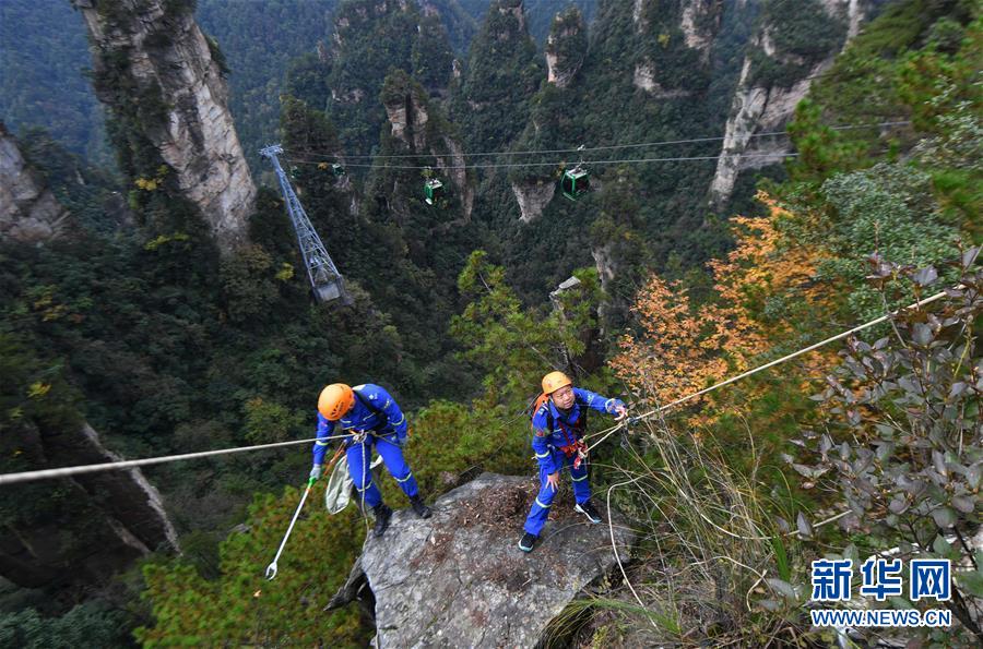 10月21日,在湖南张家界国家森林公园黄石寨景区,张家界市蓝天救援队队员索降到绝壁间捡拾游客丢弃的垃圾。 当日,在湖南张家界国家森林公园黄石寨景区,张家界市蓝天救援队在开展索降训练的同时,在悬崖绝壁间捡拾游客丢弃的塑料袋、水瓶等垃圾。 这支救援队伍由当地的一些志愿者组成,利用专业设备不定期进入景区捡拾垃圾,用实际行动呼吁广大游客关爱世界自然遗产,共同保护生态环境。 新华社记者 赵众志 摄