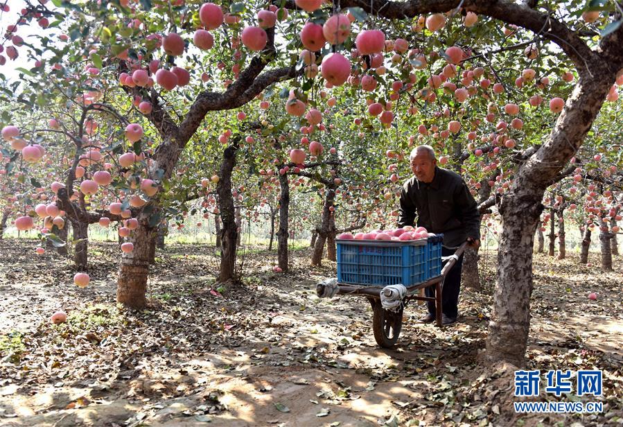 10月25日,河北省邢台市信都区宋家庄镇北店村果农在果园搬运采摘的苹果。 金秋时节,河北省邢台市信都区6.5万亩苹果进入收获季,果农们忙着采收苹果,供应市场。近年来,河北省邢台市信都区因地制宜调整农业产业结构,发展林果种植,带动农民增收致富。 新华社记者 朱旭东 摄