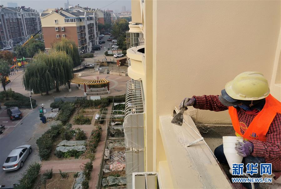 10月31日,工人在对迁安市明珠骏景小区外墙进行翻新。 居住条件的改善,承载着老百姓最朴实的期待与梦想,为达到“功能配套、整洁干净、生活方便、管理规范”的标准,河北省迁安市2020至2022年计划提升改造小区85个,改造社区面积430万平方米。 新华社记者 金良快 摄