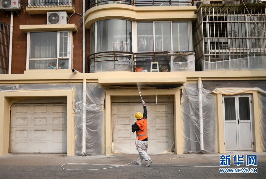 10月31日,工人在对迁安市明珠骏景小区外墙进行喷漆。 居住条件的改善,承载着老百姓最朴实的期待与梦想,为达到“功能配套、整洁干净、生活方便、管理规范”的标准,河北省迁安市2020至2022年计划提升改造小区85个,改造社区面积430万平方米。 新华社记者 金良快 摄