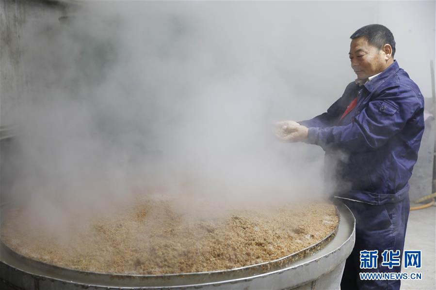 11月3日,河南省平顶山市宝丰县石桥镇邢庄村一酿酒车间,工人在查看高粱蒸熟程度。 新华社发(何五昌 摄)