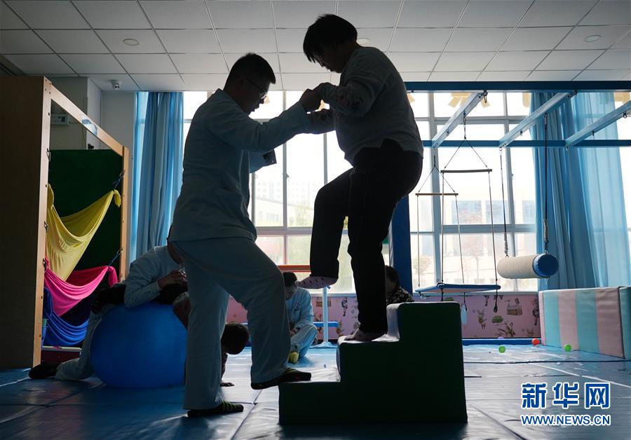 11月5日,在延安市博爱医院康复部,医护人员带领脑瘫少年参加感觉统合训练。 陕西省延安市博爱医院是延安市残疾儿童定点康复机构,其康复部现有医护人员65名,采用中西医结合方法治疗小儿脑瘫、孤独症,开展言语训练、作业治疗、感觉统合训练等,促进患儿共同发展,早日融入社会。 新华社记者 才扬 摄