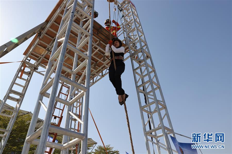 11月9日,在福建厦门五一文化广场,市民在消防员的指导下体验滑绳自救。 当日是全国消防日,各地纷纷开展消防安全宣传活动,提高人们的消防安全意识与应急避险能力。 新华社发(曾德猛 摄)