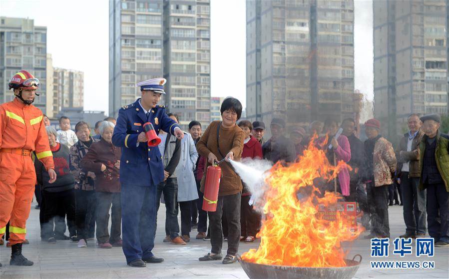 11月9日,在四川省南充市蓬安县相如文化公园,居民在消防员的指导下学习使用灭火器灭火。 当日是全国消防日,各地纷纷开展消防安全宣传活动,提高人们的消防安全意识与应急避险能力。 新华社发(刘永红 摄)
