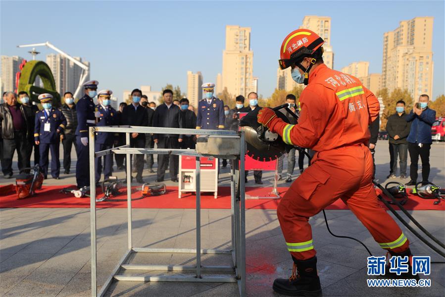 11月9日,河北省衡水市消防救援支队队员在衡水市人民广场进行消防救援演练。 当日是全国消防日,各地纷纷开展消防安全宣传活动,提高人们的消防安全意识与应急避险能力。 新华社记者 朱旭东 摄