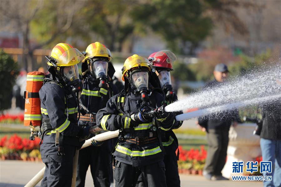 11月9日,河北省衡水市消防救援支队队员在衡水市人民广场进行消防救援演练。 当日是全国消防日,各地纷纷开展消防安全宣传活动,提高人们的消防安全意识与应急避险能力。 新华社记者 朱旭东 摄