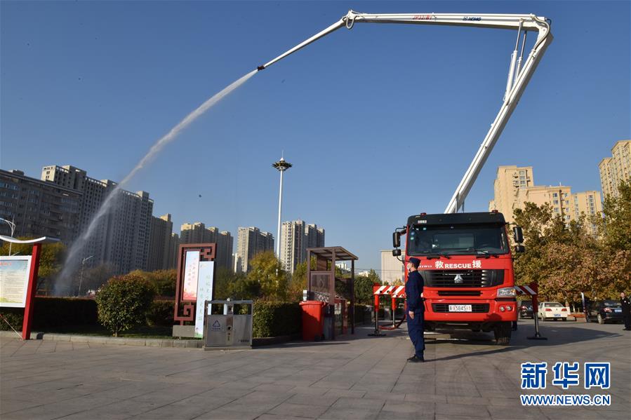 11月9日,河北省衡水市消防救援支队队员在衡水市人民广场进行消防救援演练。 当日是全国消防日,各地纷纷开展消防安全宣传活动,提高人们的消防安全意识与应急避险能力。 新华社记者 朱旭东 摄