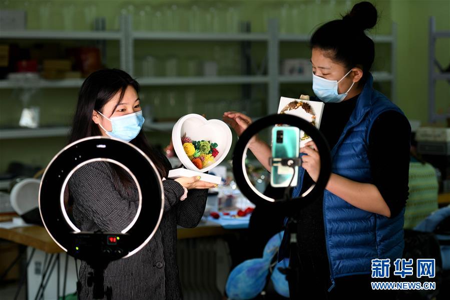 11月10日,在河北省石家庄市一家文创企业,工作人员进行直播。 “双十一”临近,不少企业纷纷抢占商机,备足商品,直播带货,开足马力迎接网络购物高峰。 新华社发(陈其保 摄)