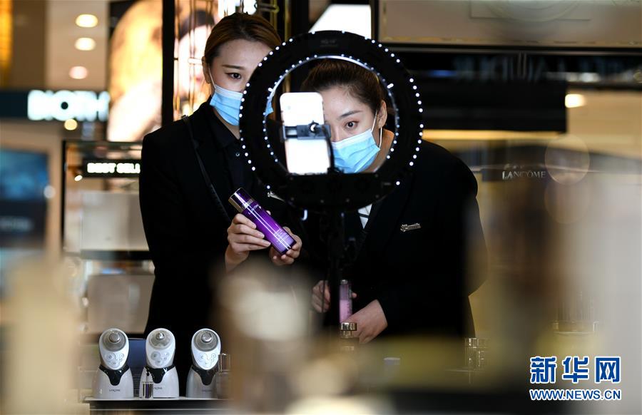 11月10日,在河北省石家庄市桥西区北国商城化妆品柜台,工作人员进行直播。 “双十一”临近,不少企业纷纷抢占商机,备足商品,直播带货,开足马力迎接网络购物高峰。 新华社发(陈其保 摄)