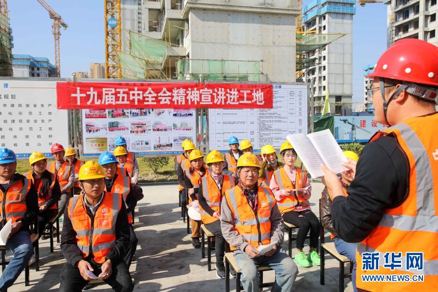 11月11日,建筑工人在项目工地上党课。当日,中铁上海局在安徽省合肥市肥西县人才公寓项目工地开展党的十九届五中全会精神宣讲活动,通过“微党课”的形式,把全会精神传达到基层。新华社记者 曹力 摄