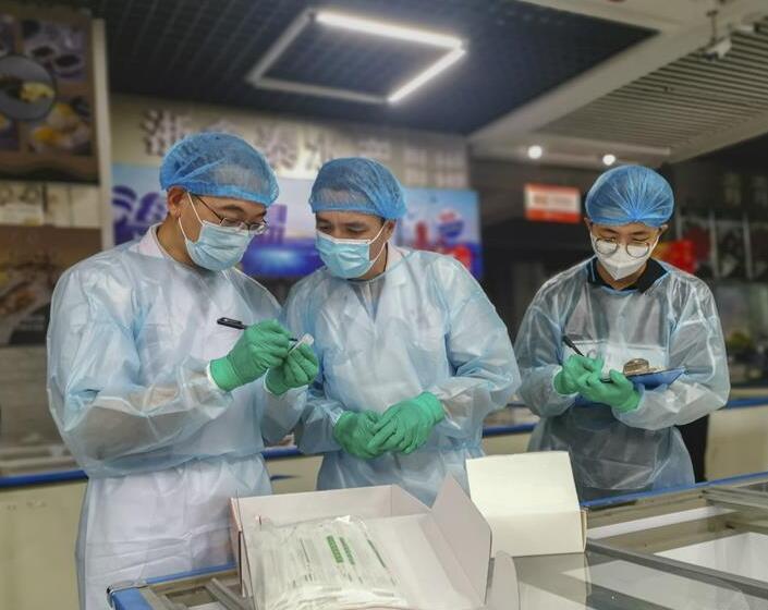 乌鲁木齐市疾控中心工作人员对乌鲁木齐一家海鲜市场外环境进行采样(7月25日手机拍摄)。