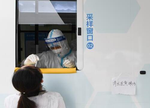 在北京市西城区北京展览馆南侧的露天广场核酸检测采样点,核酸检测采样车内的医护人员为前来做检测的人员进行采样。