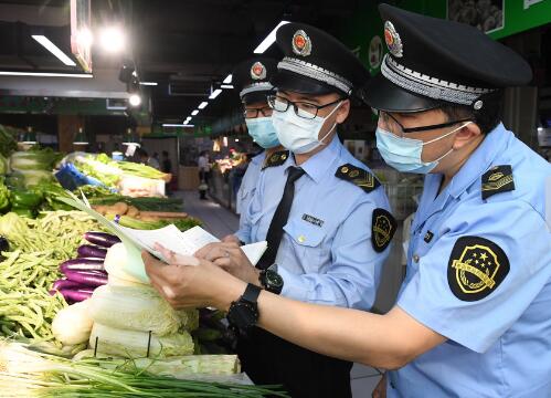 6月17日,在位于北京市海淀区的增光鸿运市场,执法人员对商户所售蔬菜的进货渠道进行检查。