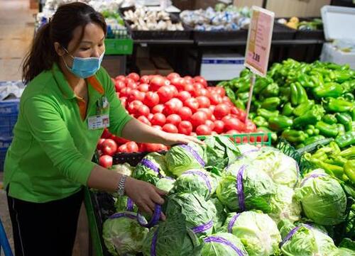 从地里采摘约24小时后,这些新鲜的圆白菜和它的“伙伴们”就被摆在了位于北京市海淀区超市发双榆树店的货架上,供周边居民选购。