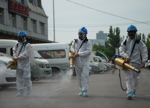 6月16日,北京蓝天救援队队员在位于丰台区的岳各庄批发市场开展消杀作业。