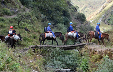 10月底,四川省凉山州西昌市银厂乡境内,4名电力运维员骑上马背进入无人区,再徒步沿着铁塔开展巡检工作。