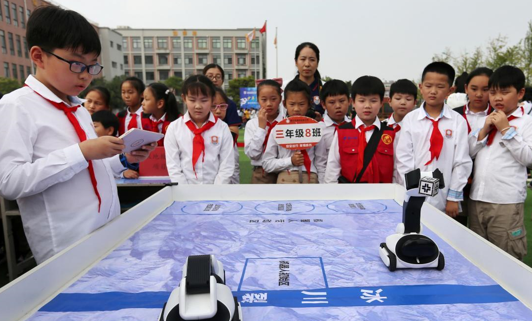 2020年9月30日,安徽省淮北市首府实验小学的小学生在参加人工智能机器人趣味赛。学生们在老师的指导下参观体验无人机展示、人工智能机器人趣味赛等十余个项目,近距离感受科技魅力。