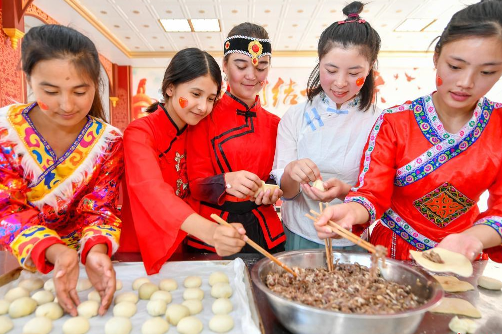 2020年10月1日,浙江省湖州市长兴职教中心新疆民族餐厅,新疆班、云贵班学生们正在雉山美食社老师的指导下体验制作传统月饼。当日,长兴县职业技术教育中心学校举行"民族团结一家亲国庆中秋大联欢"主题活动,内地新疆中职班、长兴—云贵协作扶贫定向就业班的师生们欢聚一堂,欢度国庆节和中秋佳节。
