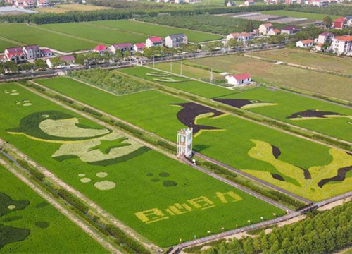 在上海崇明区横沙乡丰乐村,一片稻田画成为当地一道靓丽的风景。稻田中呈现出江豚和将于2021年在崇明举办的花博会主题元素图案,引人注目。
