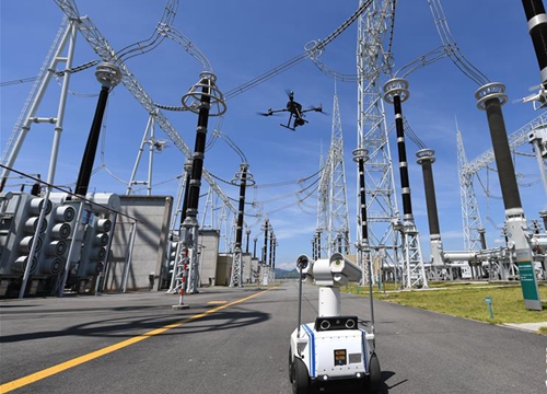 当日,在地面机器人的配合下,多架无人机在福建省福州市闽侯县大湖乡的1000千伏特高压榕城变电站实施多机协同自主巡检。