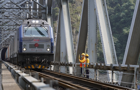 8月21日,在嘉陵江铁路钢梁大桥上,养护工人对枕木进行维护。 位于重庆北碚的嘉陵江铁路钢梁大桥,是襄渝铁路的咽喉要道。