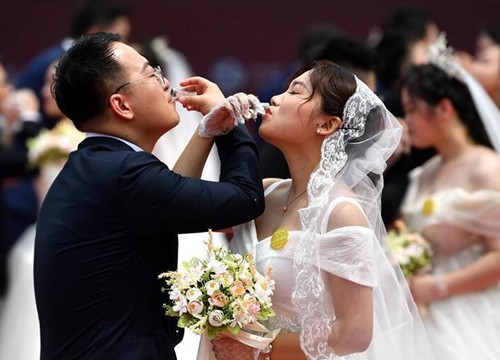 5月20日,一场为50对战“疫”情侣举行的集体婚礼在西安市永宁门文化庆典广场举行。新人们来自陕西省内的医疗、政府、公安、社区等各个行业,为抗击新冠肺炎疫情,他们延迟了婚期,奋战在各自的岗位上。